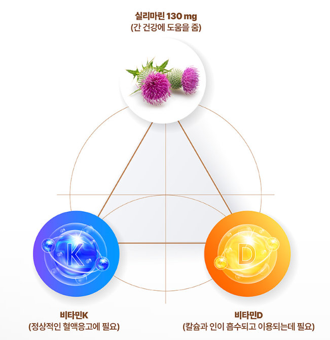 밀크씨슬 추출물 + 비타민 D + 비타민 K를 함께 담은 3중 복합 기능성 제품으로,