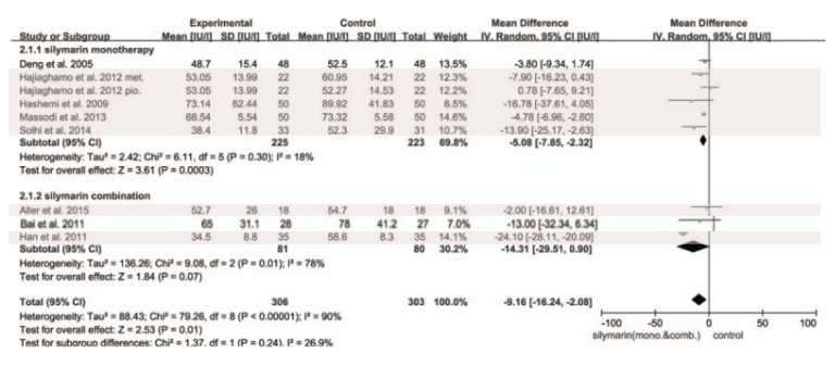 밀크씨슬의 활성 성분인 실리마린(Silymarin)은 여러 무작위대조임상시험을 모아 분석한 결과에서 간 건강 지표(AST와 ALT)를 유의미하게 감소시킨 것으로 나타났습니다.