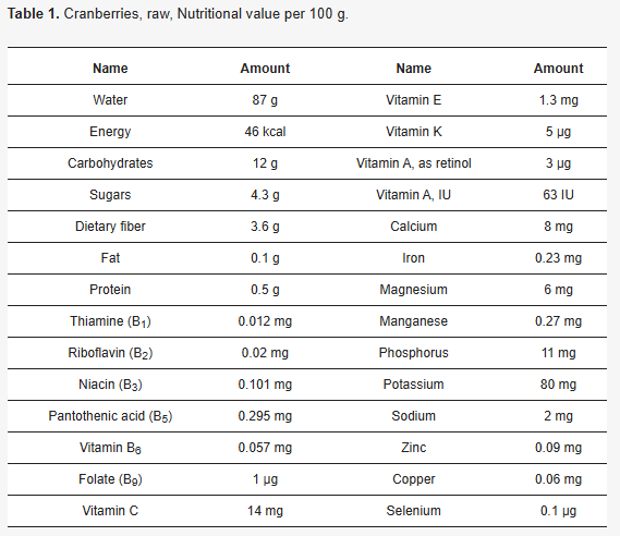 <크랜베리 100g당 성분>